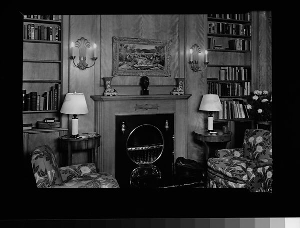 [Library Interior Showing Fireplace with Adjacent Bookshelfs and Armchairs]