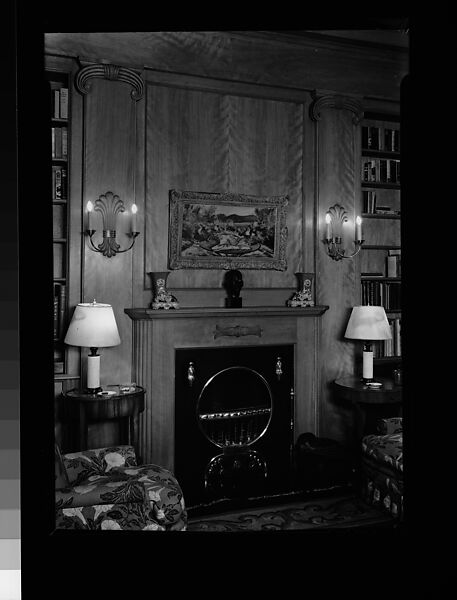 [Library Interior Showing Fireplace with Adjacent Bookshelfs and Armchairs]