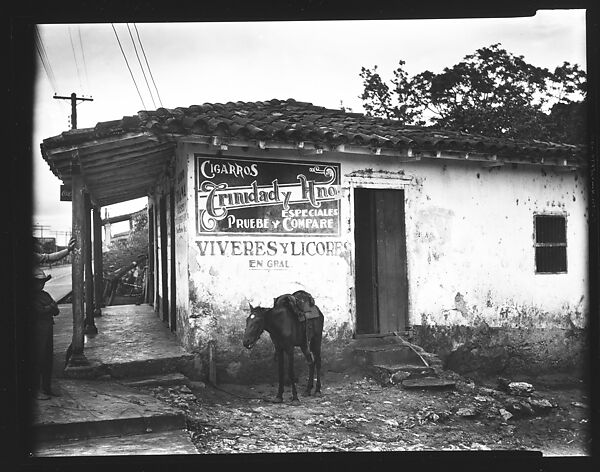 - Title:[Donkey Tied to Post Outside "La Nueva Diana" General Store, Cuba]