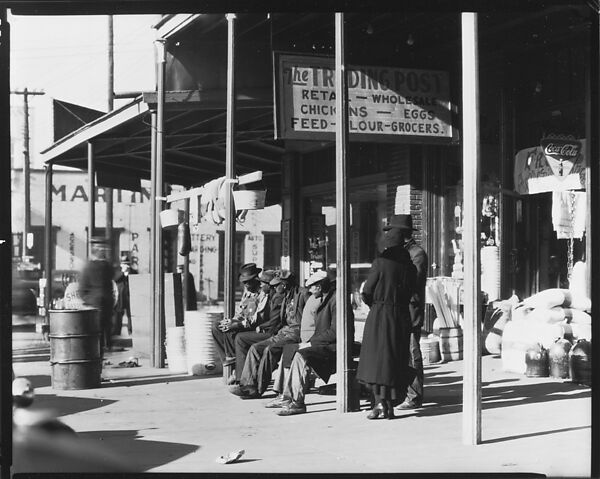 - Title: [Sidewalk Scene of Pedestrians on Bench before The Trading Post, Retail and Wholesale Store, Selma, Alabama]
