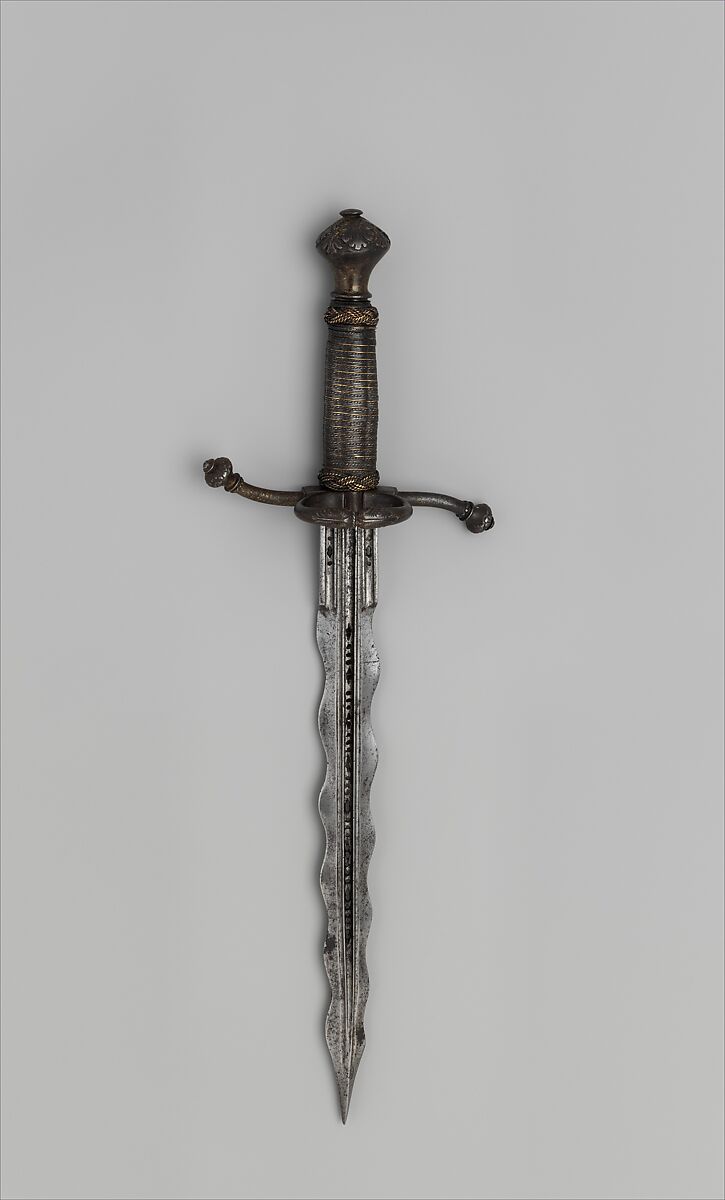 Designed to be used together with a rapier, this dagger is fitted with a side ring, recurved quillons, and a depression at the base of one side of the blade to accommodate the thumb and facilitate a firmer grip. The waves in the blade may be intended to act like "speed bumps" in breaking the impact of a blow from an opponent's blade. The piercing of the fullers (grooves) is a decorative motif.