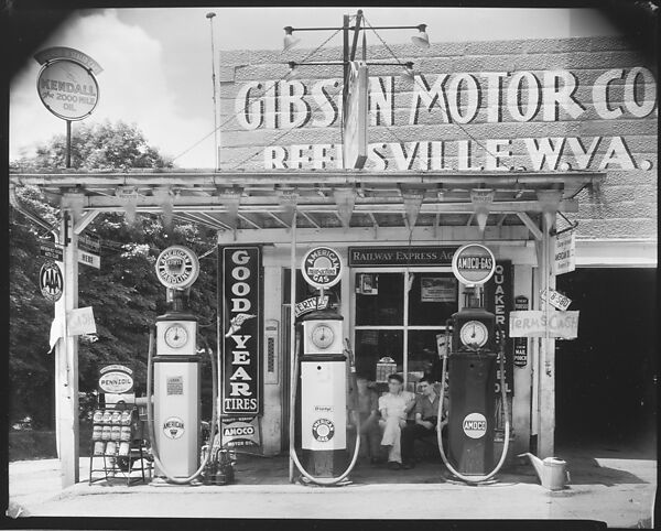 - Title: [Gibson Motor Company Gas Station with Group of Men Seated on Bench, Reedsville, West Virginia]