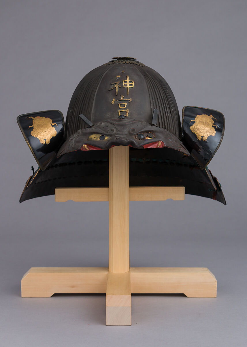 The bowl of this helmet is formed from one hundred individual radial iron plates, the overlapping edges of which form ridges (suji). The inscription on the frontal plate now reads jingū (shrine); however, the first character is missing, and it likely originally read Daijingū. This inscription may refer to the Ise Shrine, the most famous Shinto shrine in Japan, which is dedicated to the sun goddess Amaterasu. Wearing or displaying the helmet would thus have invoked divine powers.