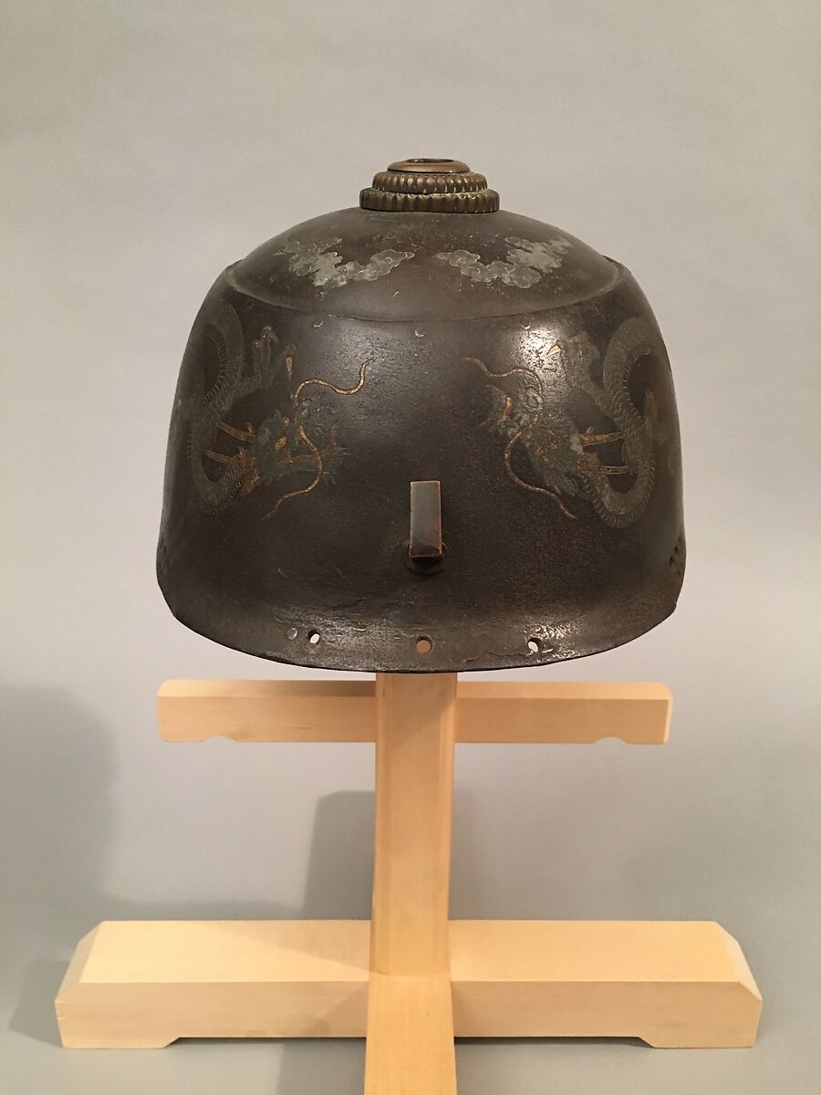 The helmet bowl (hachi) is of iron, is composed of five plates, and is a variant of the Haruta School type. The four side plates are engraved with dragons, inlaid with silver, copper and gold, and the top plate is engraved with clouds, inlaid with silver. Its peculiar shape indicates that it was made for the export market.