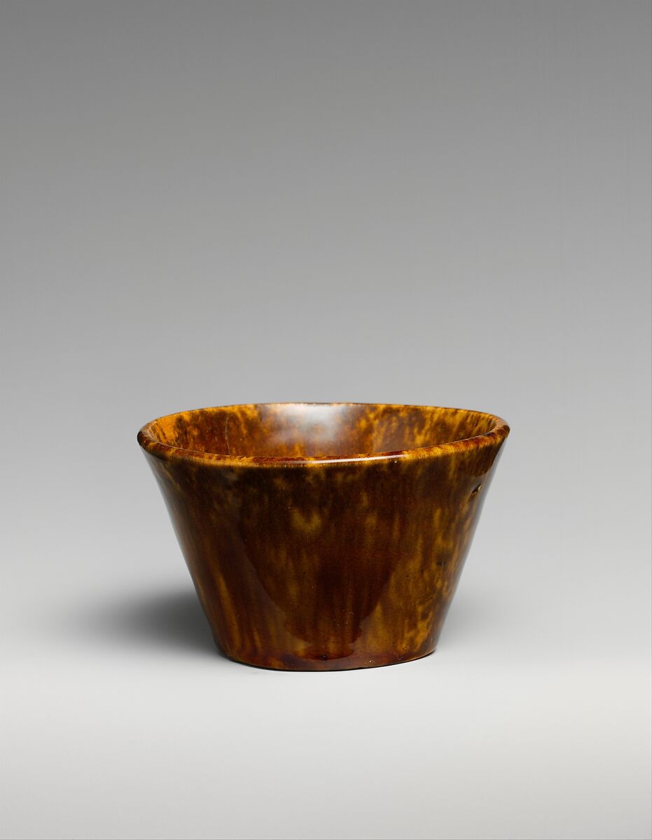 This earthenware ramekin is covered in a mottled brown and yellow "Rockingham" glaze. The bottom is unglazed.