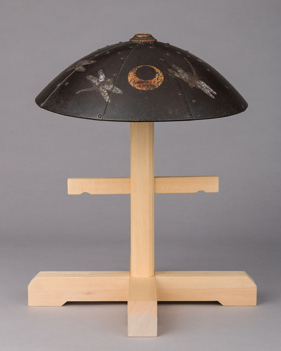 The war hat (jingasa) provided moderate protection and was worn when traveling or in camp. Composed of eight overlapping iron plates, this example is enriched with silver and gold damascened dragonflies, and it bears the crest (mon) of the Ogasawara family, lords (daimyō) of Kokura, Buzen (Fukuoka Prefecture).