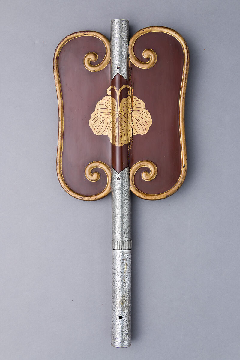 Military commanders used a type of fixed fan, called a war fan (gunbai), to signal soldiers on the battlefield. The silver mounts of this example are engraved with flowers against a stippled background, and the lower section of the shaft, which is detachable, is mounted with a concealed steel blade—an unusual feature that would have appealed to Western collectors.