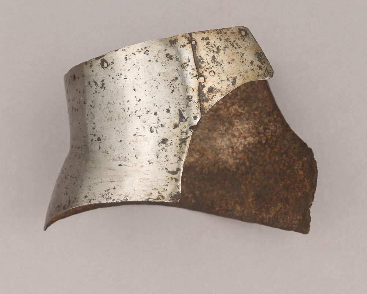 This is part of a large find of medieval armor discovered in 1840 in the ruins of the fortress of Chalcis, on the Greek island of Euboea (then a Venetian colony called Negroponte). The fortress had been captured and destroyed by the Turks in 1470. Now divided largely between the Ethnological Museum, Athens, and The Metropolitan Museum of Art, the Chalcis hoard contains many rare and unusual elements of fourteenth- and fifteenth-century armor. Of particular importance are the variety of headpieces and the many fragments of brigandines (armor for the torso constructed of small plates riveted to layers of fabric), some of which retain portions of their original velvet covering. The Chalcis armor provides a unique picture of the armament used in the Aegean, one of the easternmost military outposts of the Venetian empire.