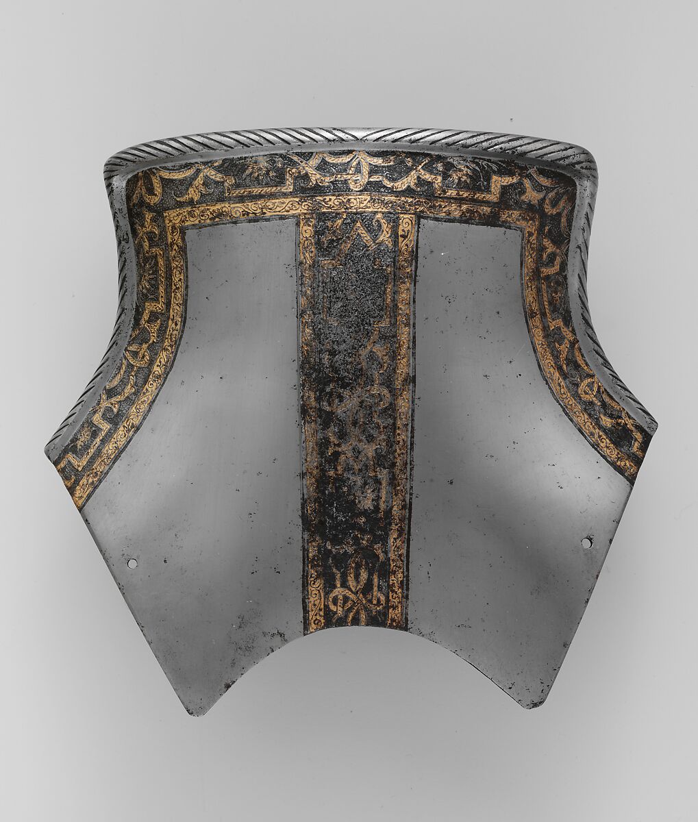 This piece provides evidence for the existence of an important Augsburg armor, otherwise unrecorded, of exceedingly high quality. Its etched decoration closely resembles that on the so-called Lark Garniture in Vienna (Hofjagd- und Rüstkammer, Kunsthistorisches Museum, A611), made in Augsburg in 1563 for Archduke Karl of Styria (1540–1590), the youngest son of Emperor Ferdinand I, who served as governor of the province of Inner Austria from that date. Named for the eagles (romantically identified as larks in the nineteenth century) on the coat of arms of Inner Austria, the armor has these birds etched within the strapwork cartouches that repeat over its surfaces. A third armor etched with a closely related strapwork design, now in the Philadelphia Museum of Art (Kienbusch Collection, 1977-167-13), bears cartouches filled with a variety of wild animals. The Metropolitan Museum's pommel plate differs from the Vienna and Philadelphia armors in small but significant details, including the pattern of the strapwork, the contents of the cartouches, and the ornament within the gilt side bands. All three armors, however, exhibit the same precise etching with strong color contrasts and a harmonious balance between the decoration and the brightly polished steel surfaces. It seems likely that they were etched in the same workshop, but unfortunately neither the name of the etcher nor that of the armorer is recorded.