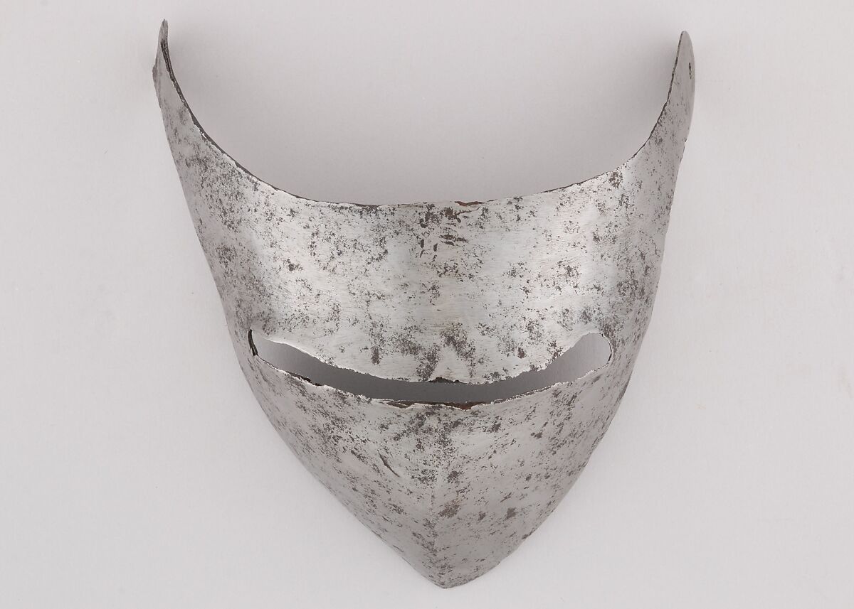 This is part of a large find of medieval armor discovered in 1840 in the ruins of the fortress of Chalcis, on the Greek island of Euboea (then a Venetian colony called Negroponte). The fortress had been captured and destroyed by the Turks in 1470. Now divided largely between the Ethnological Museum, Athens, and The Metropolitan Museum of Art, the Chalcis hoard contains many rare and unusual elements of fourteenth- and fifteenth-century armor. Of particular importance are the variety of headpieces and the many fragments of brigandines (armor for the torso constructed of small plates riveted to layers of fabric), some of which retain portions of their original velvet covering. The Chalcis armor provides a unique picture of the armament used in the Aegean, one of the easternmost military outposts of the Venetian empire.
