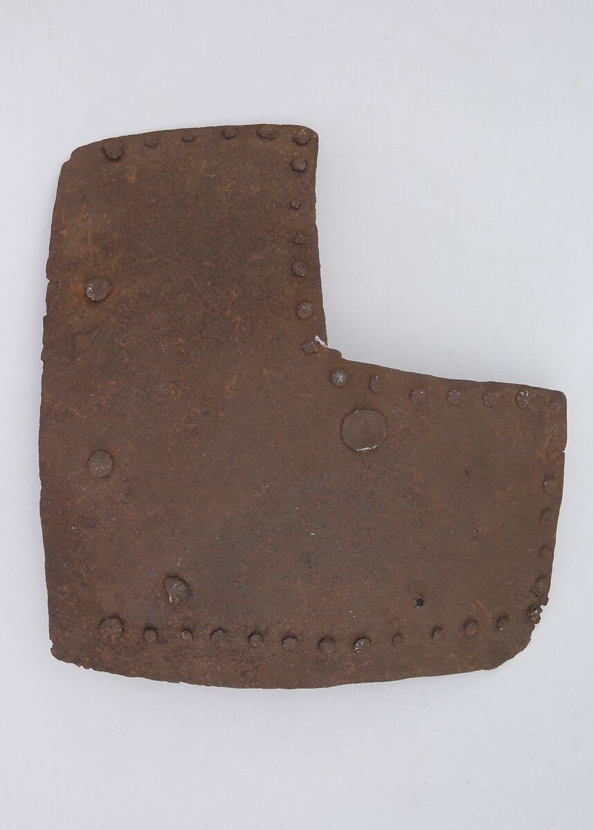 This is part of a large find of medieval armor discovered in 1840 in the ruins of the fortress of Chalcis, on the Greek island of Euboea (then a Venetian colony called Negroponte). The fortress had been captured and destroyed by the Turks in 1470. Now divided largely between the Ethnological Museum, Athens, and The Metropolitan Museum of Art, the Chalcis hoard contains many rare and unusual elements of fourteenth- and fifteenth-century armor. Of particular importance are the variety of headpieces and the many fragments of brigandines (armor for the torso constructed of small plates riveted to layers of fabric), some of which retain portions of their original velvet covering. The Chalcis armor provides a unique picture of the armament used in the Aegean, one of the easternmost military outposts of the Venetian empire.