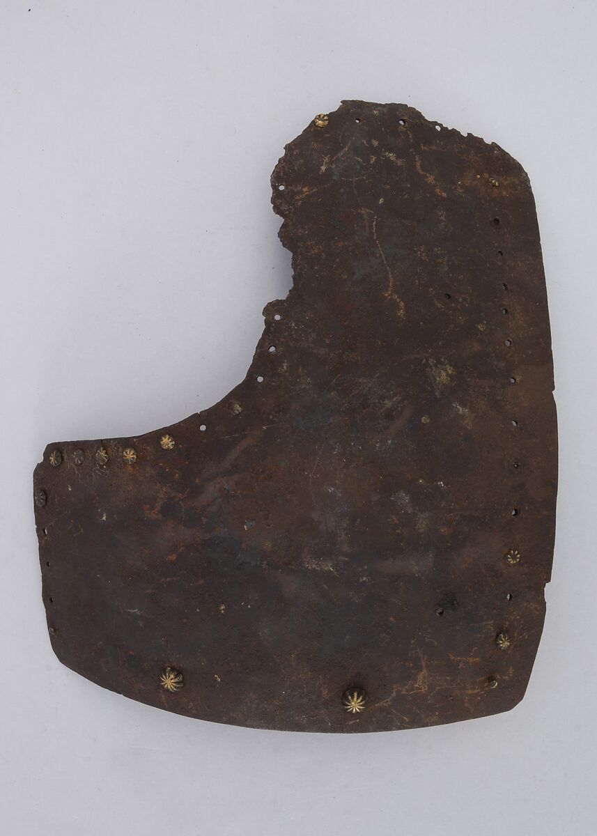 This is part of a large find of medieval armor discovered in 1840 in the ruins of the fortress of Chalcis, on the Greek island of Euboea (then a Venetian colony called Negroponte). The fortress had been captured and destroyed by the Turks in 1470. Now divided largely between the Ethnological Museum, Athens, and The Metropolitan Museum of Art, the Chalcis hoard contains many rare and unusual elements of fourteenth- and fifteenth-century armor. Of particular importance are the variety of headpieces and the many fragments of brigandines (armor for the torso constructed of small plates riveted to layers of fabric), some of which retain portions of their original velvet covering. The Chalcis armor provides a unique picture of the armament used in the Aegean, one of the easternmost military outposts of the Venetian empire.