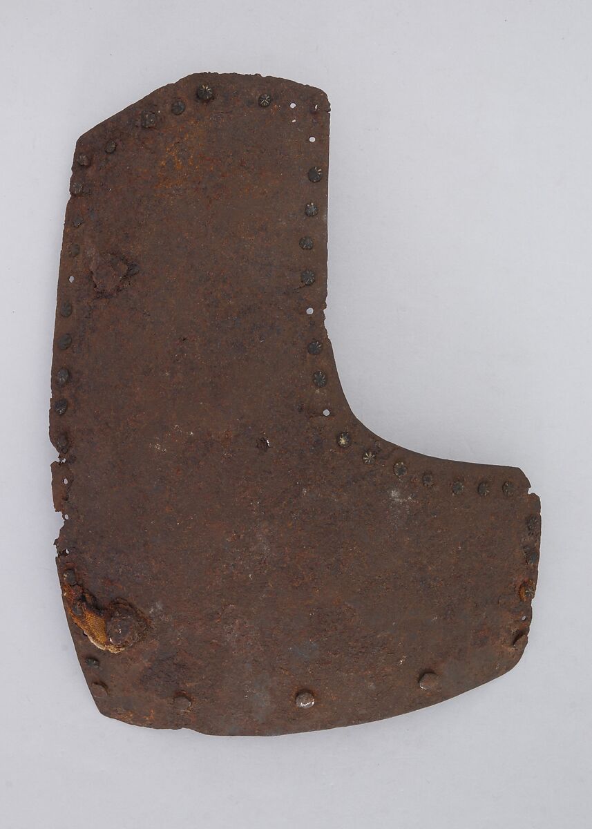 This is part of a large find of medieval armor discovered in 1840 in the ruins of the fortress of Chalcis, on the Greek island of Euboea (then a Venetian colony called Negroponte). The fortress had been captured and destroyed by the Turks in 1470. Now divided largely between the Ethnological Museum, Athens, and The Metropolitan Museum of Art, the Chalcis hoard contains many rare and unusual elements of fourteenth- and fifteenth-century armor. Of particular importance are the variety of headpieces and the many fragments of brigandines (armor for the torso constructed of small plates riveted to layers of fabric), some of which retain portions of their original velvet covering. The Chalcis armor provides a unique picture of the armament used in the Aegean, one of the easternmost military outposts of the Venetian empire.