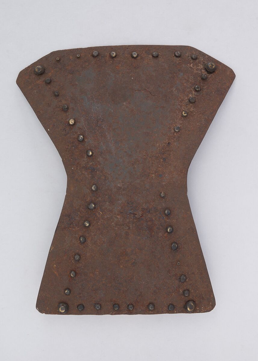 This is part of a large find of medieval armor discovered in 1840 in the ruins of the fortress of Chalcis, on the Greek island of Euboea (then a Venetian colony called Negroponte). The fortress had been captured and destroyed by the Turks in 1470. Now divided largely between the Ethnological Museum, Athens, and The Metropolitan Museum of Art, the Chalcis hoard contains many rare and unusual elements of fourteenth- and fifteenth-century armor. Of particular importance are the variety of headpieces and the many fragments of brigandines (armor for the torso constructed of small plates riveted to layers of fabric), some of which retain portions of their original velvet covering. The Chalcis armor provides a unique picture of the armament used in the Aegean, one of the easternmost military outposts of the Venetian empire.