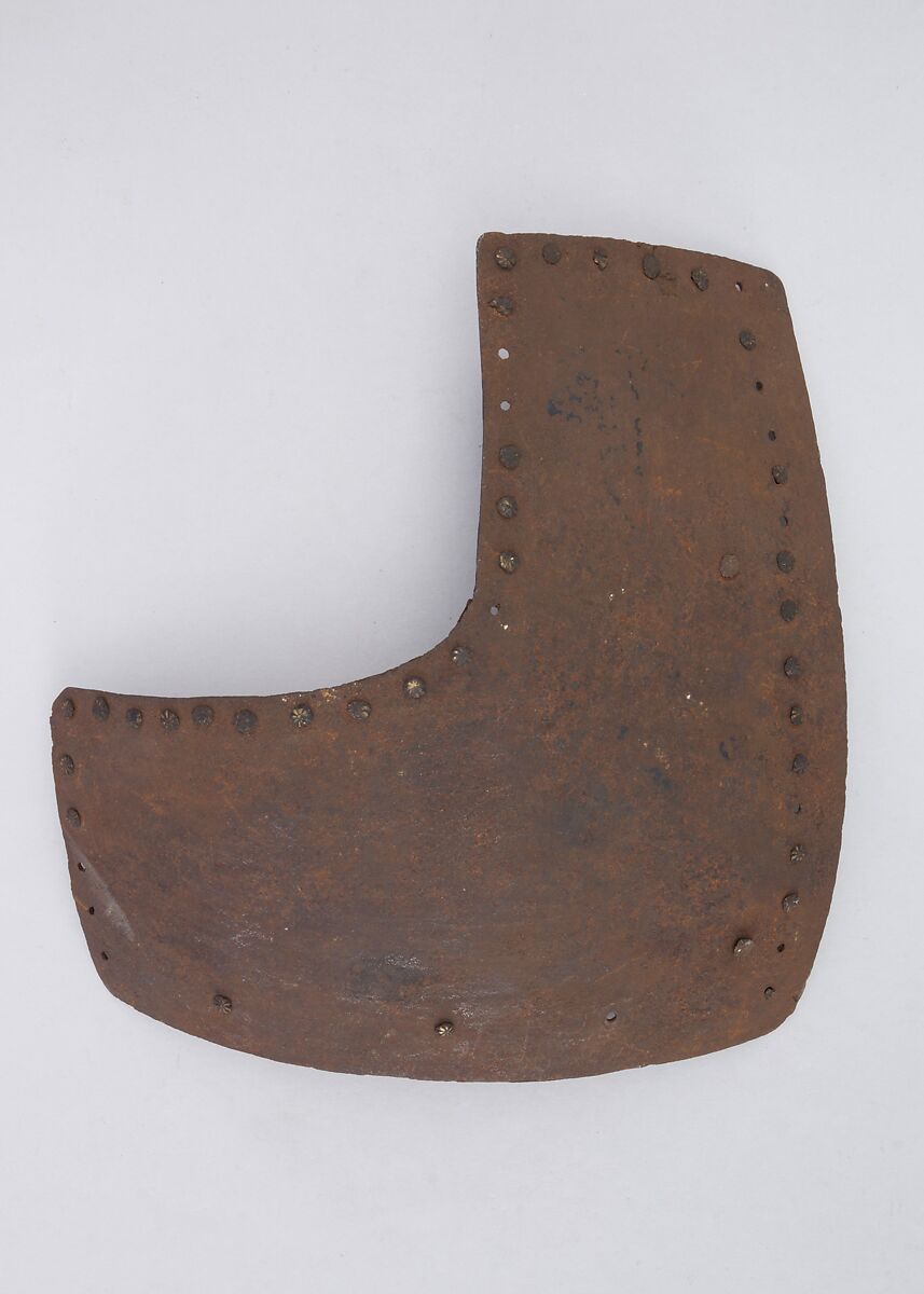This is part of a large find of medieval armor discovered in 1840 in the ruins of the fortress of Chalcis, on the Greek island of Euboea (then a Venetian colony called Negroponte). The fortress had been captured and destroyed by the Turks in 1470. Now divided largely between the Ethnological Museum, Athens, and The Metropolitan Museum of Art, the Chalcis hoard contains many rare and unusual elements of fourteenth- and fifteenth-century armor. Of particular importance are the variety of headpieces and the many fragments of brigandines (armor for the torso constructed of small plates riveted to layers of fabric), some of which retain portions of their original velvet covering. The Chalcis armor provides a unique picture of the armament used in the Aegean, one of the easternmost military outposts of the Venetian empire.