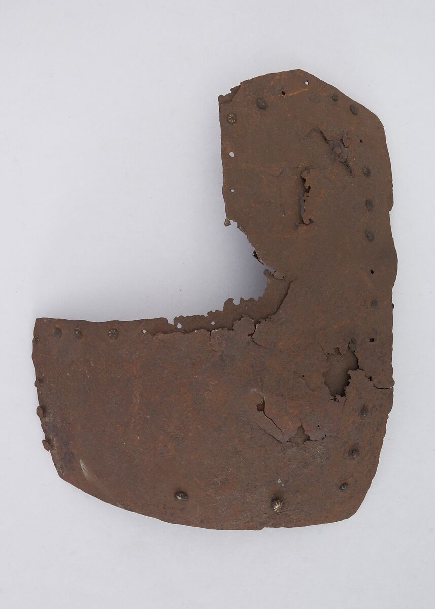This is part of a large find of medieval armor discovered in 1840 in the ruins of the fortress of Chalcis, on the Greek island of Euboea (then a Venetian colony called Negroponte). The fortress had been captured and destroyed by the Turks in 1470. Now divided largely between the Ethnological Museum, Athens, and The Metropolitan Museum of Art, the Chalcis hoard contains many rare and unusual elements of fourteenth- and fifteenth-century armor. Of particular importance are the variety of headpieces and the many fragments of brigandines (armor for the torso constructed of small plates riveted to layers of fabric), some of which retain portions of their original velvet covering. The Chalcis armor provides a unique picture of the armament used in the Aegean, one of the easternmost military outposts of the Venetian empire.