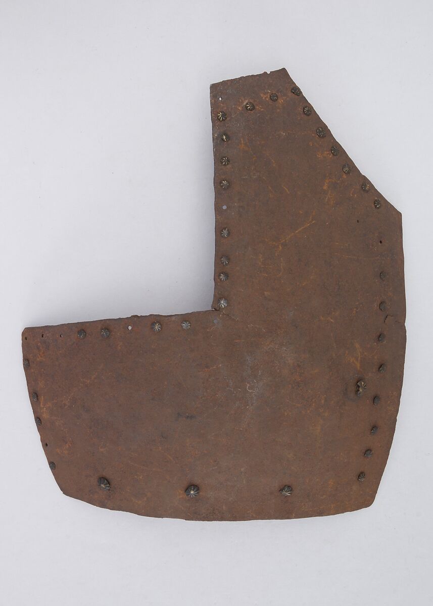 This is part of a large find of medieval armor discovered in 1840 in the ruins of the fortress of Chalcis, on the Greek island of Euboea (then a Venetian colony called Negroponte). The fortress had been captured and destroyed by the Turks in 1470. Now divided largely between the Ethnological Museum, Athens, and The Metropolitan Museum of Art, the Chalcis hoard contains many rare and unusual elements of fourteenth- and fifteenth-century armor. Of particular importance are the variety of headpieces and the many fragments of brigandines (armor for the torso constructed of small plates riveted to layers of fabric), some of which retain portions of their original velvet covering. The Chalcis armor provides a unique picture of the armament used in the Aegean, one of the easternmost military outposts of the Venetian empire.