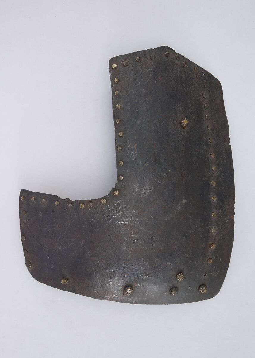 This is part of a large find of medieval armor discovered in 1840 in the ruins of the fortress of Chalcis, on the Greek island of Euboea (then a Venetian colony called Negroponte). The fortress had been captured and destroyed by the Turks in 1470. Now divided largely between the Ethnological Museum, Athens, and The Metropolitan Museum of Art, the Chalcis hoard contains many rare and unusual elements of fourteenth- and fifteenth-century armor. Of particular importance are the variety of headpieces and the many fragments of brigandines (armor for the torso constructed of small plates riveted to layers of fabric), some of which retain portions of their original velvet covering. The Chalcis armor provides a unique picture of the armament used in the Aegean, one of the easternmost military outposts of the Venetian empire.