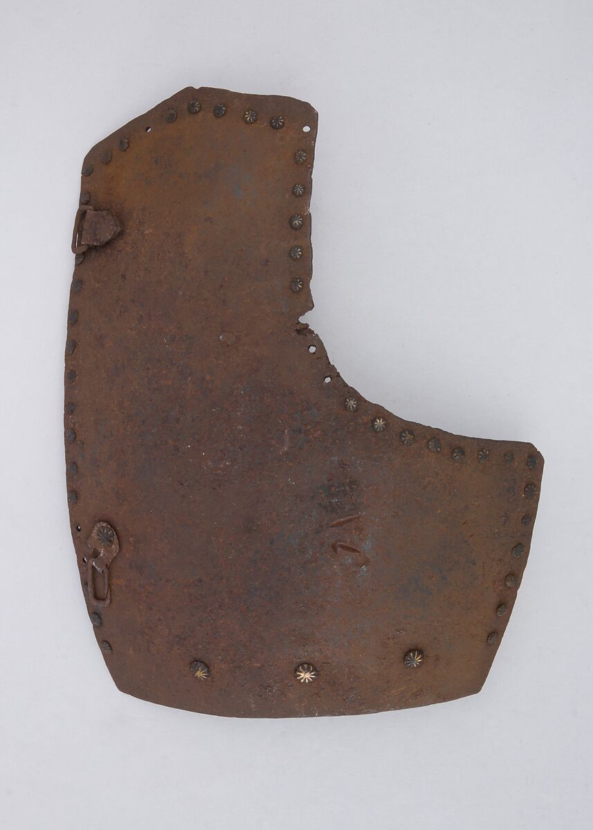 This is part of a large find of medieval armor discovered in 1840 in the ruins of the fortress of Chalcis, on the Greek island of Euboea (then a Venetian colony called Negroponte). The fortress had been captured and destroyed by the Turks in 1470. Now divided largely between the Ethnological Museum, Athens, and The Metropolitan Museum of Art, the Chalcis hoard contains many rare and unusual elements of fourteenth- and fifteenth-century armor. Of particular importance are the variety of headpieces and the many fragments of brigandines (armor for the torso constructed of small plates riveted to layers of fabric), some of which retain portions of their original velvet covering. The Chalcis armor provides a unique picture of the armament used in the Aegean, one of the easternmost military outposts of the Venetian empire.