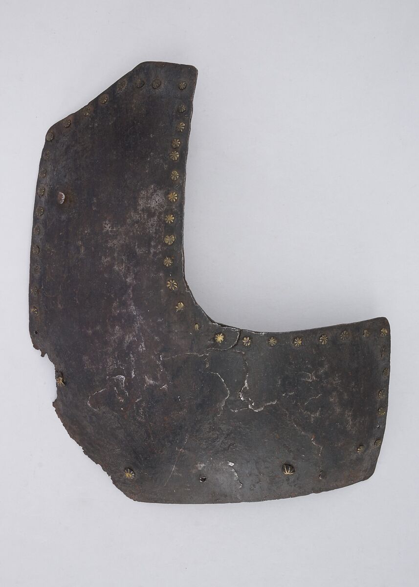 This is part of a large find of medieval armor discovered in 1840 in the ruins of the fortress of Chalcis, on the Greek island of Euboea (then a Venetian colony called Negroponte). The fortress had been captured and destroyed by the Turks in 1470. Now divided largely between the Ethnological Museum, Athens, and The Metropolitan Museum of Art, the Chalcis hoard contains many rare and unusual elements of fourteenth- and fifteenth-century armor. Of particular importance are the variety of headpieces and the many fragments of brigandines (armor for the torso constructed of small plates riveted to layers of fabric), some of which retain portions of their original velvet covering. The Chalcis armor provides a unique picture of the armament used in the Aegean, one of the easternmost military outposts of the Venetian empire.
