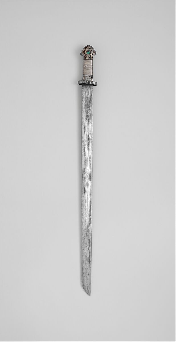 This sword is a representative example of the most familiar Tibetan form, well made and of fairly good quality. The surface of the blade has a prominent hairpin pattern, an important characteristic of traditional Tibetan swords. The pattern consists of seven dark lines alternating with six light lines, caused by the repeated folding of two different types of iron, which were combined to make the blade during the forging process.