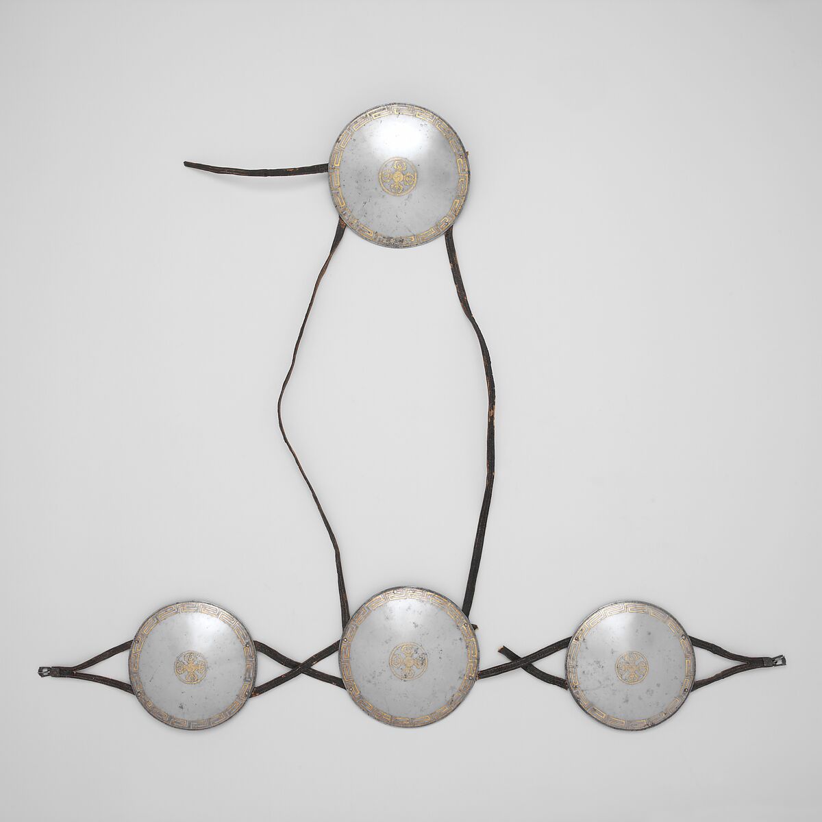 • Dimensions: Breastplate and back plate, Diam. 8 in. (20.3 cm); side plates, Diam. 7 1/8 in. (18.1 cm); Wt. 3 lb. 9.8 oz. (1638.6 g)