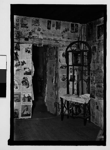 - Title:[Interior with Newspaper-Covered Walls and Wicker Mirror Stand, Hale County?, Alabama]