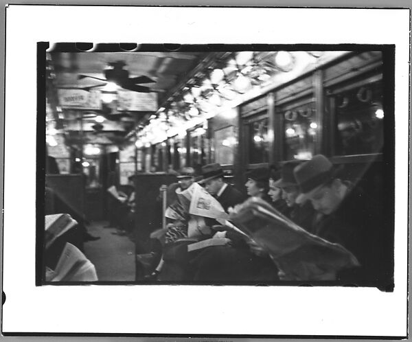 Between 1938 and 1941 Evans produced a remarkable series of portraits in the New York City subways. With a 35mm Contax camera strapped to his chest, its lens peeking out between two buttons of his winter coat, Evans was able to photograph his fellow passengers surreptitiously and at close range. Although the setting was public, he found that his subjects, unposed and lost in their thoughts, displayed a constantly shifting medley of moods and expressions-by turns curious, bored, amused, despondent, dreamy, and dyspeptic. "The guard is down and the mask is off," he remarked. "Even more than in lone bedrooms (where there are mirrors), people's faces are in naked repose down in the subway."