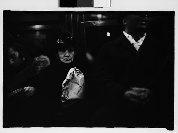 - Title: [One 35mm Film Frame: Subway Passengers, New York City: Elderly Woman Clutching Paper Bag, Seated Between Man and Woman]