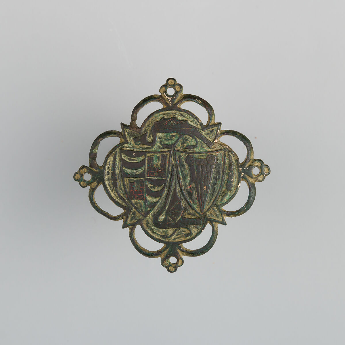 Heraldry, or coat-of-arms, were vitally important in Europe throughout the Middle Ages and the Renaissance. Heraldic emblems were used to identify noble families, cities, regions, and even countries. In addition to being displayed on shields and flags, heraldry was incorporated into architectural decoration on the interior and the exterior of buildings, on furniture, works of art, clothing, and horse equipment. Harness pendants, like this example, would have been attached to a headstall, bridle, or other straps making up the tack of a horse ridden by a nobleman or noblewoman, or a member of their household. Many harness pendants also have decoration that is simply ornamental, or have symbols that are not specifically heraldic in nature.