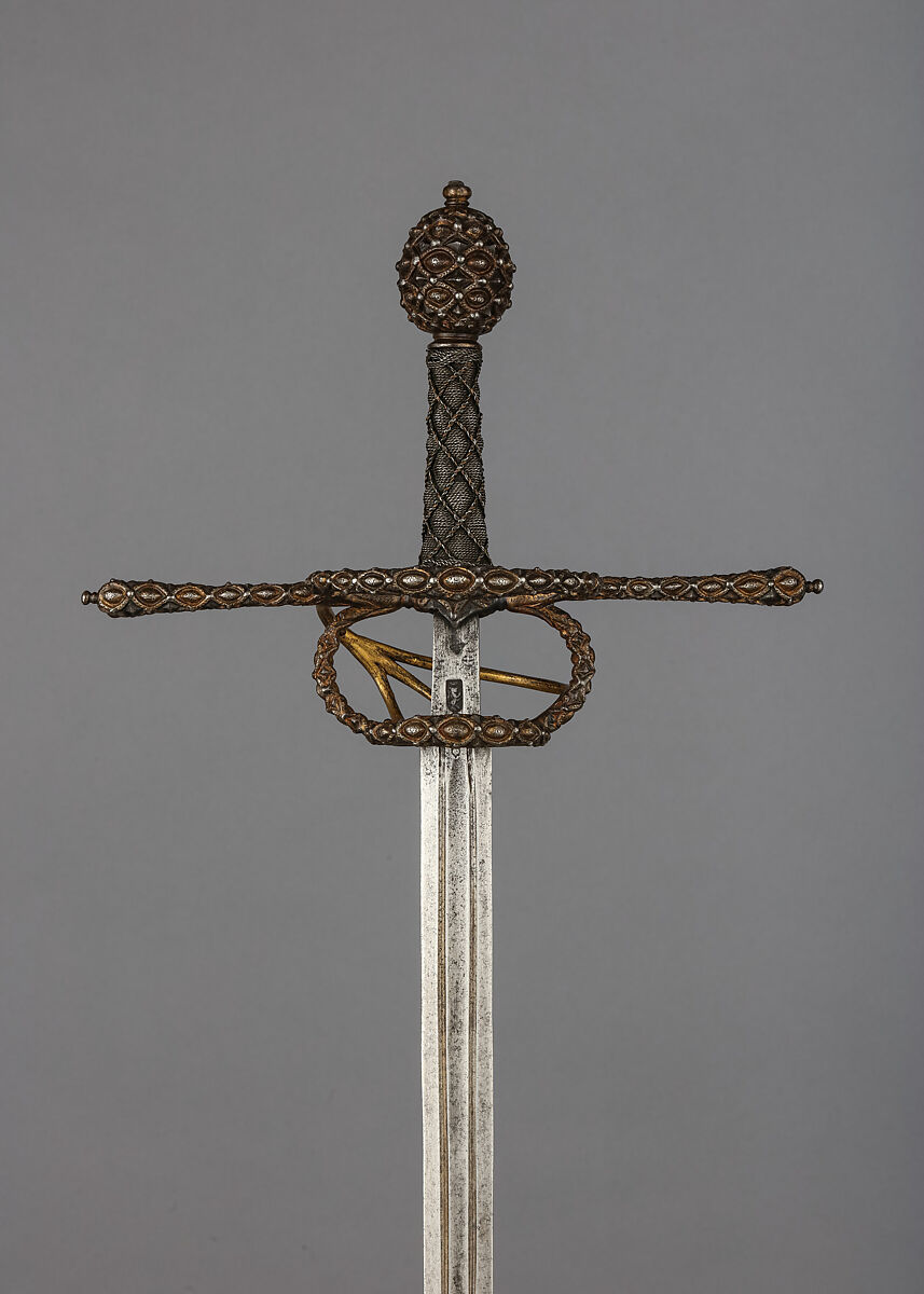 The rapier was the principal civilian sidearm throughout the sixteenth and seventeenth centuries. Designed for cut-and-thrust fencing of progressively complex techniques, the rapier is characterized by a double-edged blade with an acute point and an elaborate guard for the hand. The guards, usually of iron or steel, were subject to a variety of embellishment. They were engraved, chiseled, gilded, damascened, and encrusted in gold and silver in keeping with fashionable styles.
