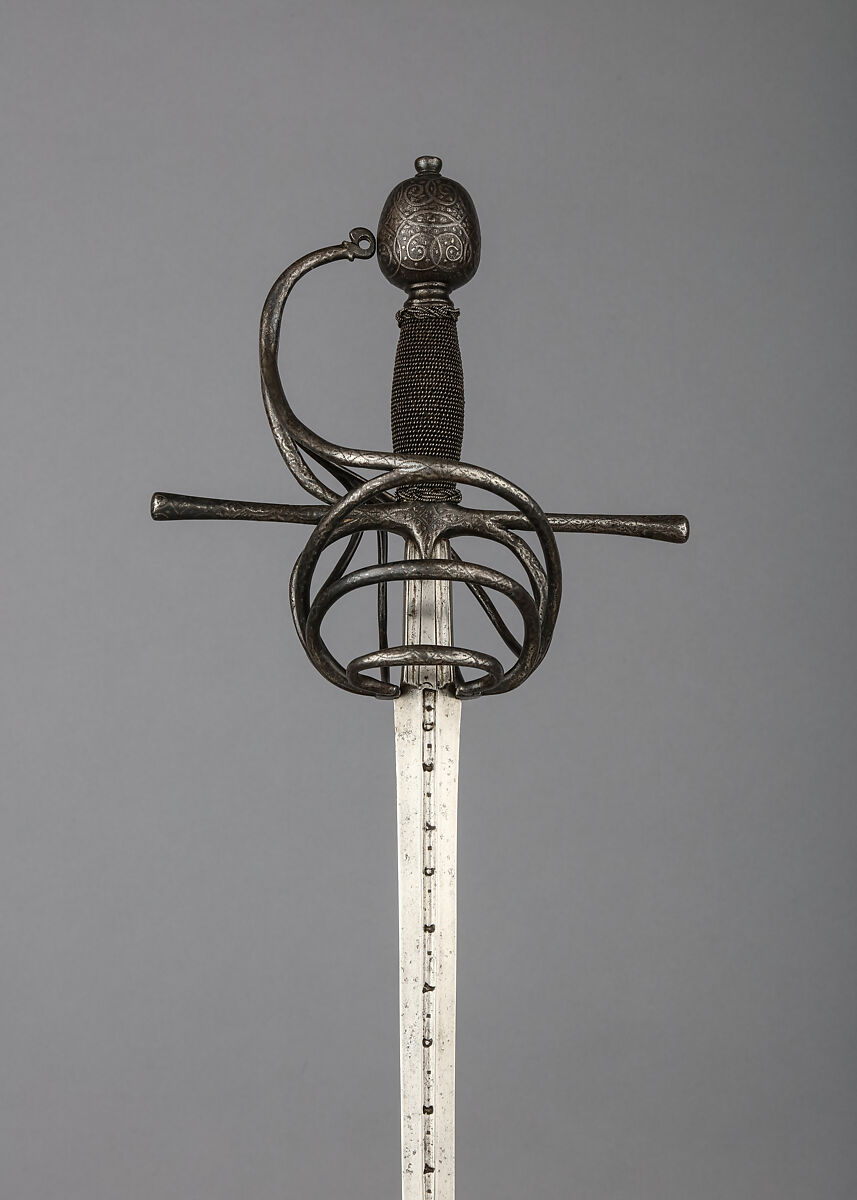 The rapier was the principal civilian sidearm throughout the sixteenth and seventeenth centuries. Designed for cut-and-thrust fencing of progressively complex techniques, the rapier is characterized by a double-edged blade with an acute point and an elaborate guard for the hand. The guards, usually of iron or steel, were subject to a variety of embellishment. They were engraved, chiseled, gilded, damascened, and encrusted in gold and silver in keeping with fashionable styles.