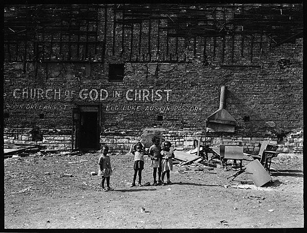 - Title: [Children in Abandoned Lot in Front of Brick Wall with Sign for "Church of God", Chicago, Illinois]