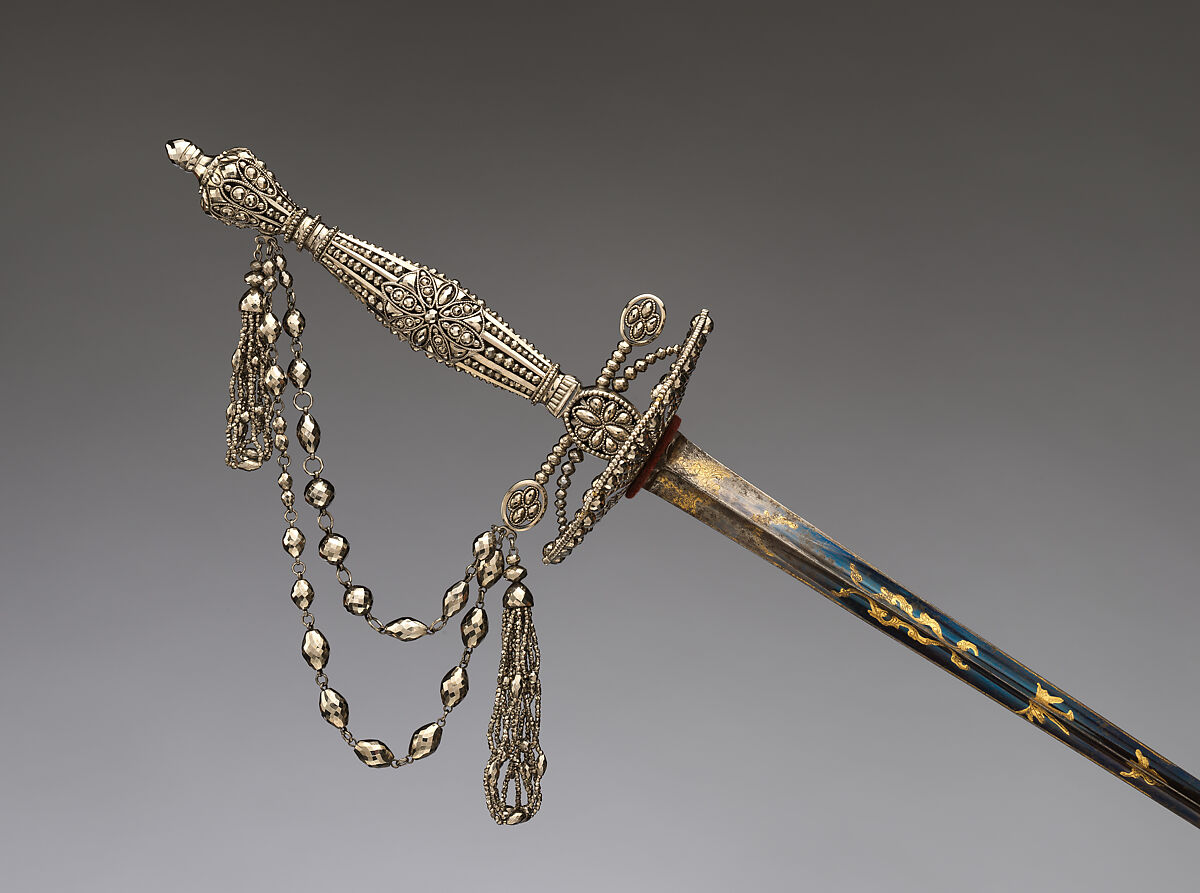 The smallsword was the typical civilian sidearm worn in Europe from about 1650 to 1800. It was both a deadly weapon and a stylish costume accessory for the fashionable gentleman. The materials of smallsword hilts vary considerably, according to the wealth and taste of their owner. In England, silver was the preferred medium, and the custom of hallmarking silver with date-letters provides the opportunity to document changing forms and ornament. English smallswords served as models for Colonial American silversmiths.