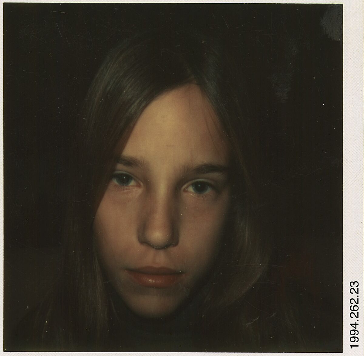 Evans was in poor health when he began to work with the Polaroid SX‑70 in 1973; he was attracted to the camera's small, elegant design and the instant color prints it generated that required no tedious lab or darkroom work. Like the developing Polaroid print itself, with its miraculous and immediate image, Evans came to life and worked feverishly with the new camera. At the age of seventy, he returned to many of his lifelong themes, including vernacular architecture, domestic interiors, and roadside signage. He also expanded his repertoire with a large series of portraits of woman, including neighbors, friends, and his young students at Oberlin College in Ohio where Evans was a guest lecturer in January-March 1974.