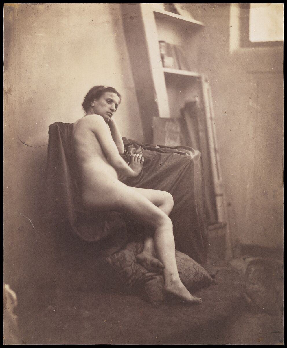 This corner of a painter’s atelier somewhere in France in the middle of the nineteenth century is scarcely tethered to time or place; it could as easily be a loft in New York today or, had photography existed four centuries earlier, a studio in the Italian Renaissance. What is surprising here is the absence of even the thinnest disguise—no swags of drapery, elaborate coiffure, or skeins of beads as are commonly found in the work of other purveyors of "studies for artists." Here, the model is utterly naked. With her intelligent head and dirty feet, this young woman helped found the matter-of-fact modeling sorority joined a decade later by Édouard Manet’s Olympia.