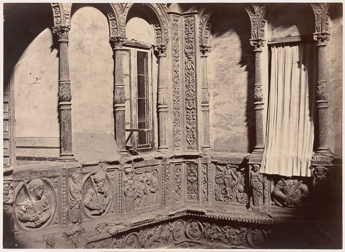 The photograph represents the patio balcony in the house where the infante Luis Antonio, a son of the eighteenth-century king of Spain, Philip V, was forced to retire after marrying a woman beneath his station. Not long after Clifford's visit, many pieces of the extraordinary plateresque decoration were removed and sold abroad. While the photograph documents the deteriorated state of the house, its unsettling quality emanates less from desuetude than from the mysterious curtain at the right, which in effect decapitates the knight in the cartouche below. In the work of a photographer whose ideal was complete and generalized description, the curtain in the dark-cornered vignette might be considered a mistake. But as Clifford consistently constructed telling images from selected details, the eccentric picture may well be a poignant commentary on the demise of the noble arts and on the personal obscurity of the banished infante.