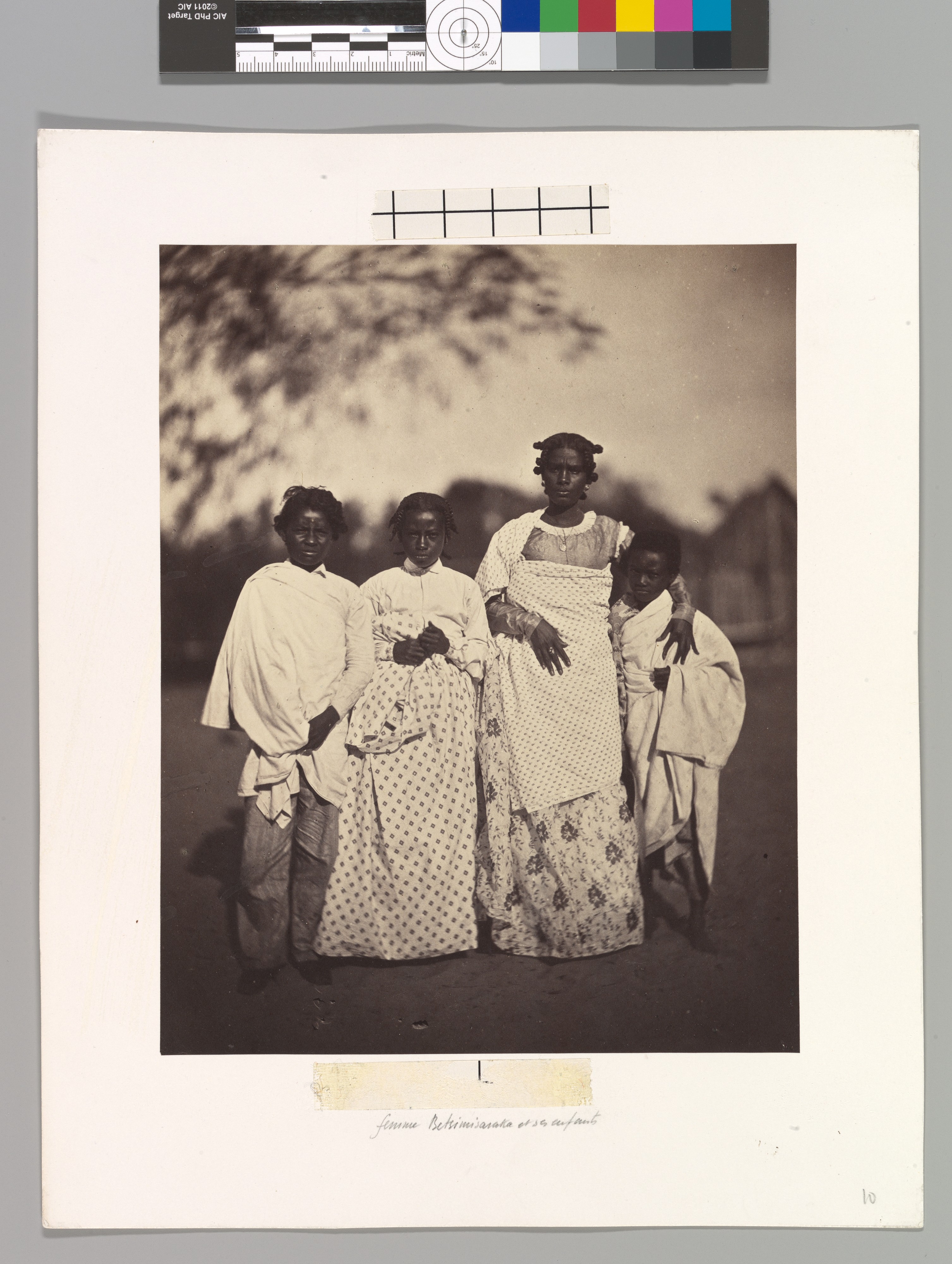 Because of the lack of cooperation he received from the government, run by the Hova, the most powerful ethnic group in Madagascar, Charnay's exploration of the island was limited to a few excursions around the port of Tamatave, on the east coast. This photograph of a Betsimitsaraka family was taken on Nossi-Malaza, the Island of Delights on Lake Nossi-Be, a lagoon south of Tamatave. Charnay noted the warm welcome he received there, the lanky beauty of the women, and the general air of affluence. He described the women's braided hair and their graceful costume: a shoulder wrap, a shirt of silk or cotton, and a long printed skirt imported from India. The woman in the photograph wears such garments, indicative of her high status; her son, on the right, is simply wrapped in a lamba, or cotton shawl, while the young man on the left, wearing pants, shows the European influence. Charnay's directness and clarity of style show to particular advantage in this image, his sympathetic rendering belying his normally more clinical approach. He was obviously drawn by the sitters' composure, the strength of their family bond, and the harmonious ensemble they presented to the camera.
