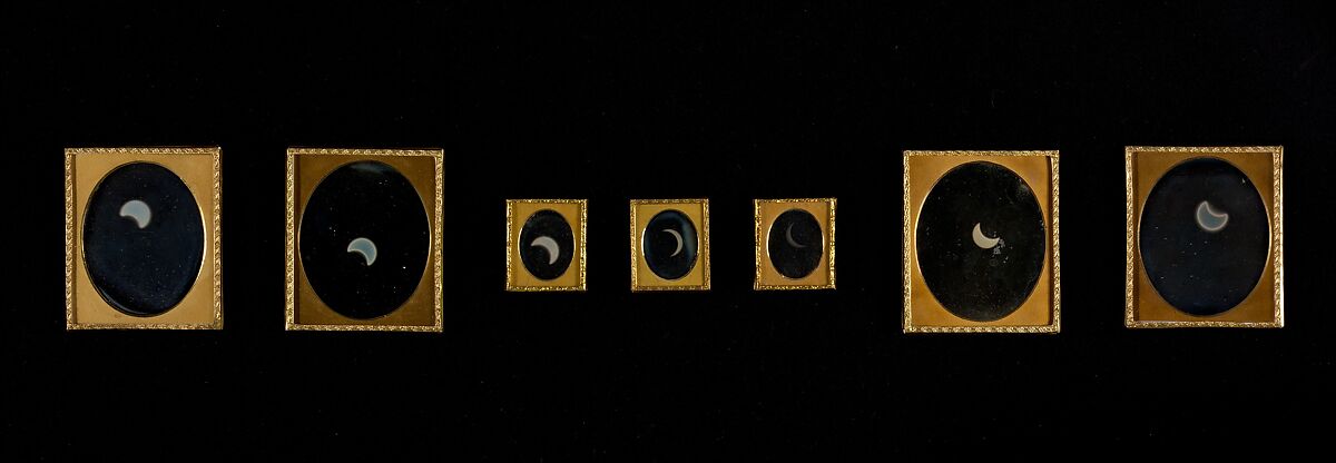 In 1841-42, William and Frederick Langenheim opened a daguerreotype studio in Philadelphia. Known for their technical innovations, the former journalists were not the city's first but were certainly its most celebrated photographers. On May 26, 1854, the Langenheim brothers made eight sequential photographs of the first total eclipse of the sun visible in North America since the invention of photography. Although six other daguerreotypists and one calotypist are known to have documented the event, only these seven daguerreotypes survive. In the northern hemisphere, the moon always shadows the sun from right to left during a solar eclipse; these images therefore seem odd because they are, like all uncorrected daguerreotypes, reversed laterally as in a mirror.