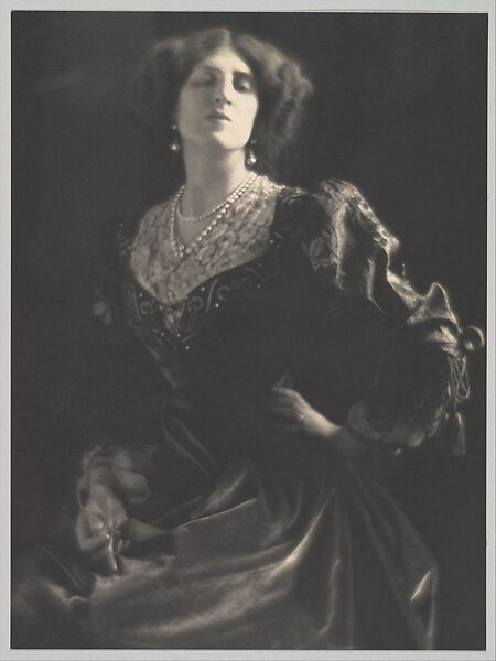 De Meyer made several portraits of Lady Ottoline. None went as far as this one in conjuring up the sitter's flamboyant persona, capturing, through dramatic lighting and Pre-Raphaelite design, her untamed, baroque quality. "Her long, pale face, that she carried lifted up, somewhat in the Rossetti fashion, seemed almost drugged, as if a strange mass of thoughts coiled in the darkness within her." D. H. Lawrence's inspired description of the character based on Lady Ottoline in "Women in Love" finds a vivid counterpart in the photographer's art.