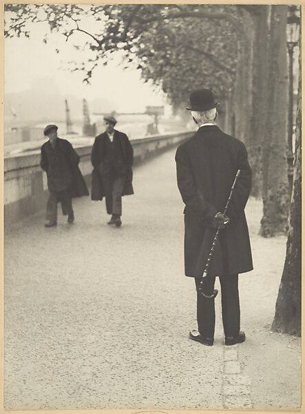 Joseph Prudhomme was a character invented by the French caricaturist Henry Monnier in 1830. Emblematic of an entire class of French society, Prudhomme was the perfect bourgeois: set in his respect for institutions and conventions, rigid in his posture, and banal in his statements. In French, the name bears the connotations of both a prudent and a prudish man, and Kertész carries on the tradition in this portrayal. M. Prudhomme, now retired, is seen taking his afternoon constitutional, perhaps less for its benefit to his health than out of adherence to convention. We observe the meticulously dressed gentleman along the Quai d'Orsay, bowler in place, cane in tow, feet firmly planted on the ground, his attitude suggesting a wary aloofness of the two approaching proletarians.
