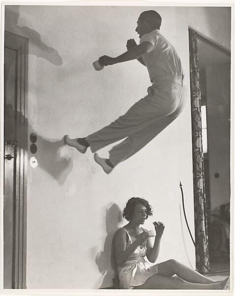 Munkacsi's photograph of the dancers Tibor von Halmay and Eva Sylt appeared in a November 1932 issue of "Die Dame." The picture is enlivened by the man's acrobatics, his morning coffee presumably having jolted him with a burst of energy. His partner's nonplused self-absorption, her oblivion to the odd goings-on above her head, and the electrical cord that snakes up the wall infuse the picture with a quirky, surrealistic incongruity.