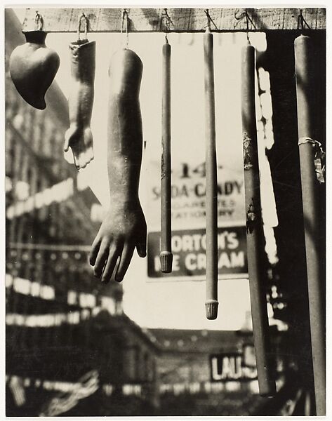 Evans's interest in street signs, both commercial and handcrafted, shows the influence of Eugène Atget, specifically his photographs of Parisian shopwindows that had been admired by the Surrealists. This photograph of a crudely constructed sidewalk advertisement for religious articles was probably made in an Italian neighborhood on the lower East Side of Manhattan. In the printing stage, Evans cropped the negative at both the bottom and top to eliminate the heads of pedestrians and to hang the votive candles and offerings from the top of the picture, much as his contemporary Joseph Cornell might have placed them in a box. In a brilliant assessment of the scene, Evans superimposed graphic signs onto textual signs, a conflation that represents one of his first attempts to merge pictures with words.