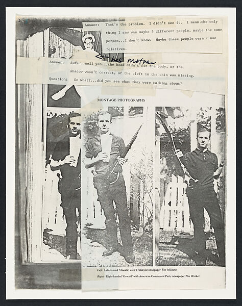 Bacher created this piece in response to a request for a book of interviews with artists based in San Francisco. Fulfilling and subverting the task simultaneously, Bacher "interviewed" herself on the subject of Lee Harvey Oswald, the man who assassinated President Kennedy and became the subject of obsessive study by conspiracy theorists. Partly inspired by the ragged cut-and-paste graphics of the nascent punk-rock movement, Bacher's schizophrenic self-portrait is assembled from photocopies of images purportedly showing the shadowy assassin, who himself may have been two or more conspirators posing as "Oswald." A mad fugue of mechanical reproduction gone awry, Bacher's perceptual hall of mirrors is finally about the blind spot implicit in all representation. It is also a quintessentially 1970s form of identity quest filtered through the shards and fragments of cultural memory.