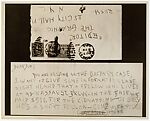 This intriguing photograph documents a letter sent to the editor of New York's Daily Graphic newspaper over a month after the disappearance was publicized and is an example of a photograph made for evidentiary purposes. The letter, which includes a small sketch of a pair of human eyes that substitute for its author's signature, describes the perpetrator as a "short fellow" who was paid to commit the crime. However, Fish, a tall man who was already elderly by 1927, had apparently not been motivated by money.