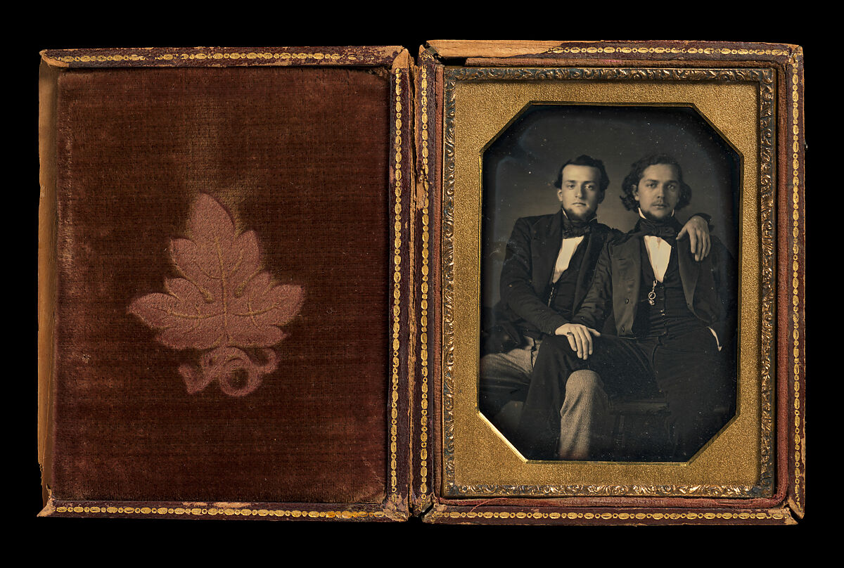 Among the many momentous social transformations generated by photography's invention was the possibility of self-representation by a large variety of groups previously excluded from official portraiture. Seamstresses, carpenters, gold miners, and even the recently deceased sat for their official portraits, leaving behind an extremely valuable record of their anonymous, if not invisible, lives. This portrait shows two young men in a tender embrace, their thighs entwined, sharing a suggestive moment before the camera. Are they lovers? Perhaps, but more likely this photograph is an example of the natural and unselfconscious intimacy and physical contact that men enjoyed in a pre-Freudian era.