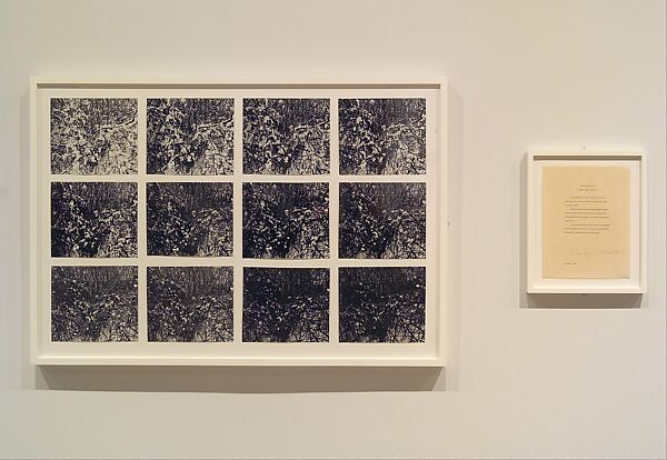 This early work by Huebler is the eleventh in his Duration series, and was made in Bradford, Massachusetts, where the artist taught at a local liberal arts college for women. It forgoes the madcap (epitomized by his Variable series, in which he attempted to photograph everyone on the planet) in favor of a placid, Zen-like austerity. Focusing hypnotically on a snow-laden bush of spiky branches, Huebler's humdrum subject-photographed twelve times from a fixed position at fifteen minute intervals-is transformed into a readymade sculpture undergoing organic, material transformation, the various stages of a densely worked drawing, and a mirror in nature of the tonal reversal (from snow white to brush black) that underlies the negative-positive process of the medium in which he is working.