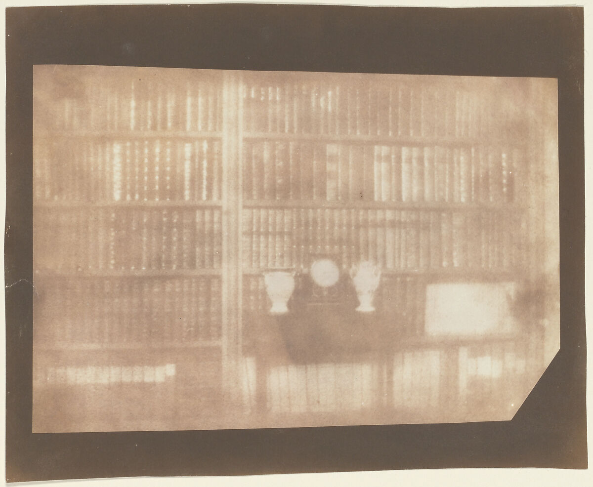 By taking a photogenic drawing negative made in the camera (here, trimmed irregularly) and placing it on top of a second piece of sensitized paper, as he had done earlier with plant specimens, Talbot could reverse the tones of his picture a second time to produce a positive print. The early results, particularly when photographing in interior light, were soft and ephemeral, as if the rows of books, floating vases, and handless clock were apparitions rather than solid objects.