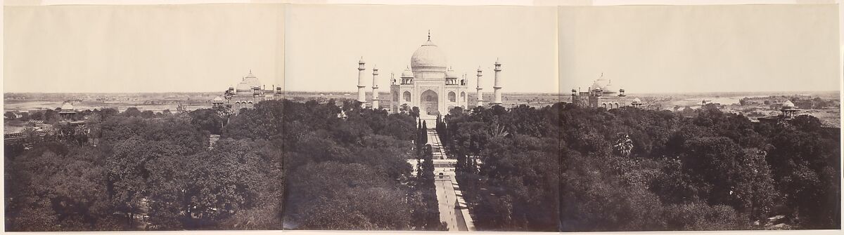 Of all the photographs Murray made of the Taj, the most impressive are his triptych panoramas, taken from the roof of the entrance gate and looking down and across the formal gardens to the mausoleum beyond. Perched high above the heavily wooded gardens, the pale building appears almost translucent in the early morning sunlight. So often described as a tribute to feminine beauty, the monument itself becomes an architectural odalisque reclining against dark silky billows.