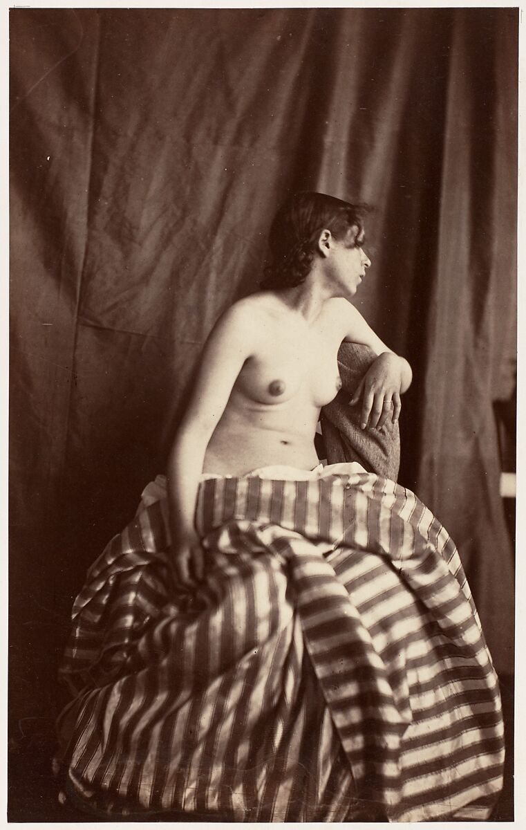 Durieu was a lawyer and early advocate and practitioner of photography in France. In 1853-54 he made a series of photographic studies of nude and costumed figures as models for artists. The French Romantic painter Eugène Delacroix helped him pose the figures and later praised the results, from which he and other artists sketched. Often photographers posed their models in attitudes based on sanctioned works of classical statuary or Old Master paintings, ostensibly providing artists with photographic académies as an alternative to live models. The mantle of high art also served to cloak (albeit somewhat transparently) the nakedness of such images and thereby protect the photographer from the actions of the censor and the viewer from the scorn of society.